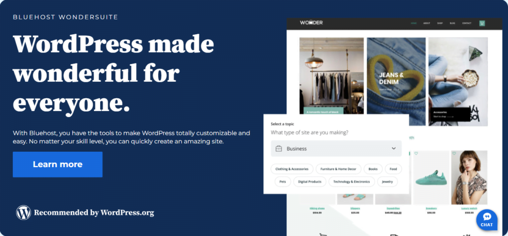 Take your WordPress websites to the next level with Bluehost WonderSuite. Bluehost provides fast website creation methods coupled with intuitive management tools. Whether you’re launching a new eCommerce store, managing client sites, or starting a blog, Bluehost has everything you need. Every plan includes: